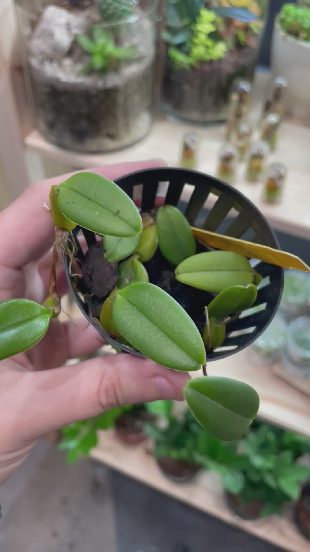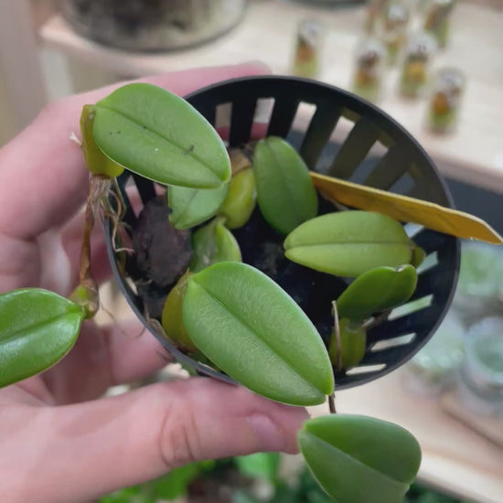 Very cute compact bulbs. Leaves are rounded and bulbs are closer to yellow. Produces small red and yellow spotted flowers. Bulbophyllum orchids prefer high humidity and will thrive in low-medium indirect light. They bloom frequently in mixed seasons. Great candidate for vivariums and terrariums.