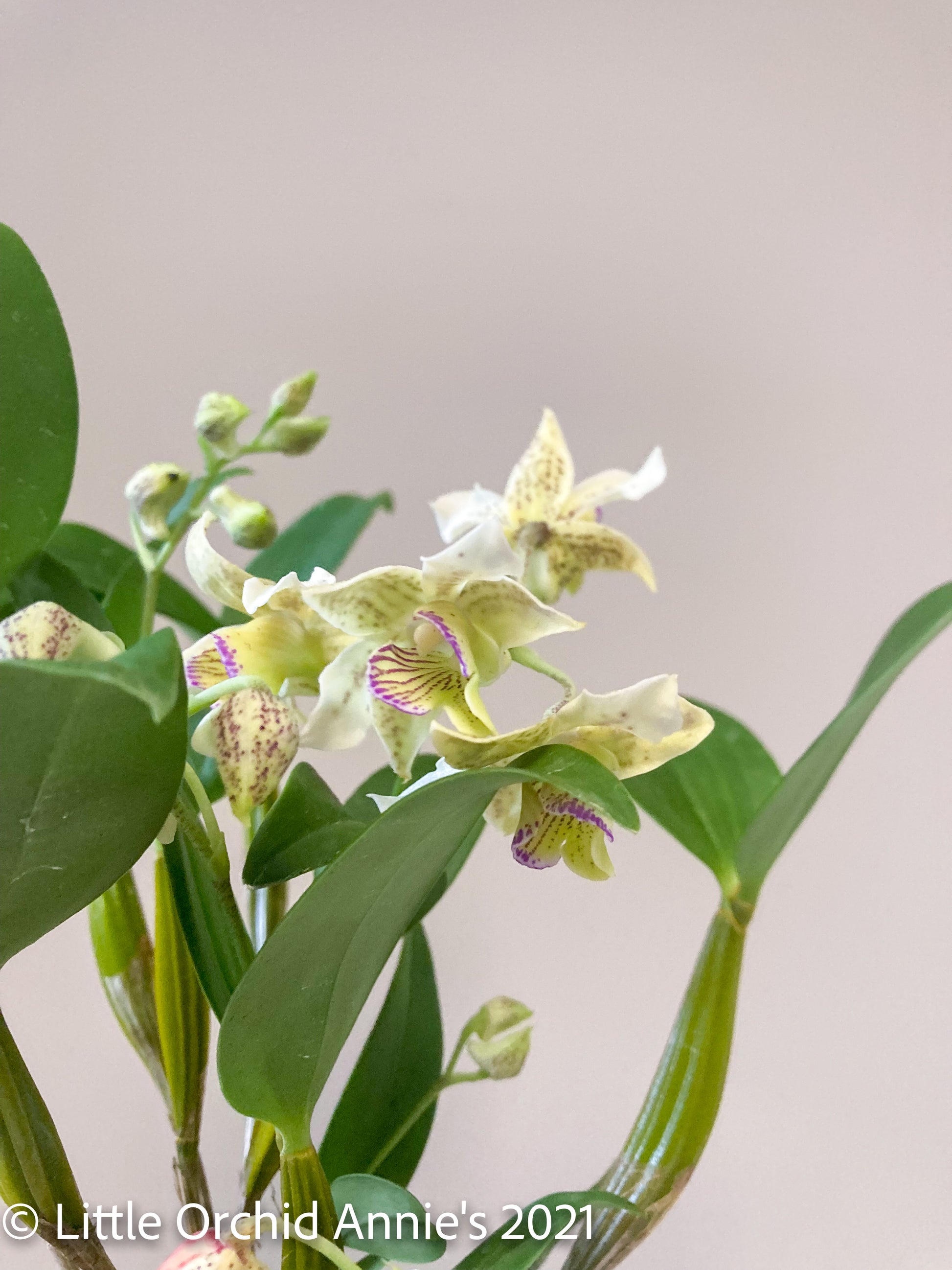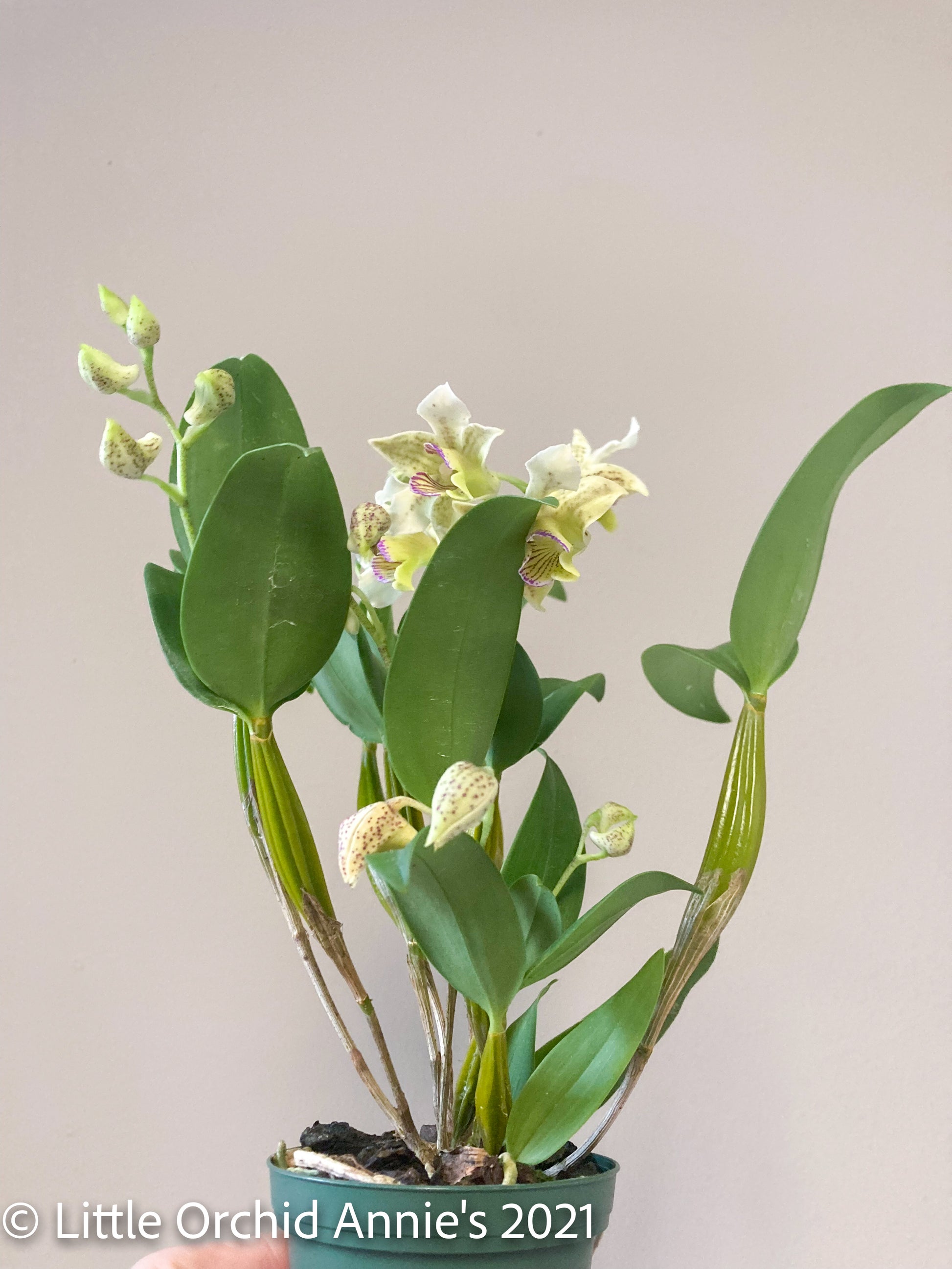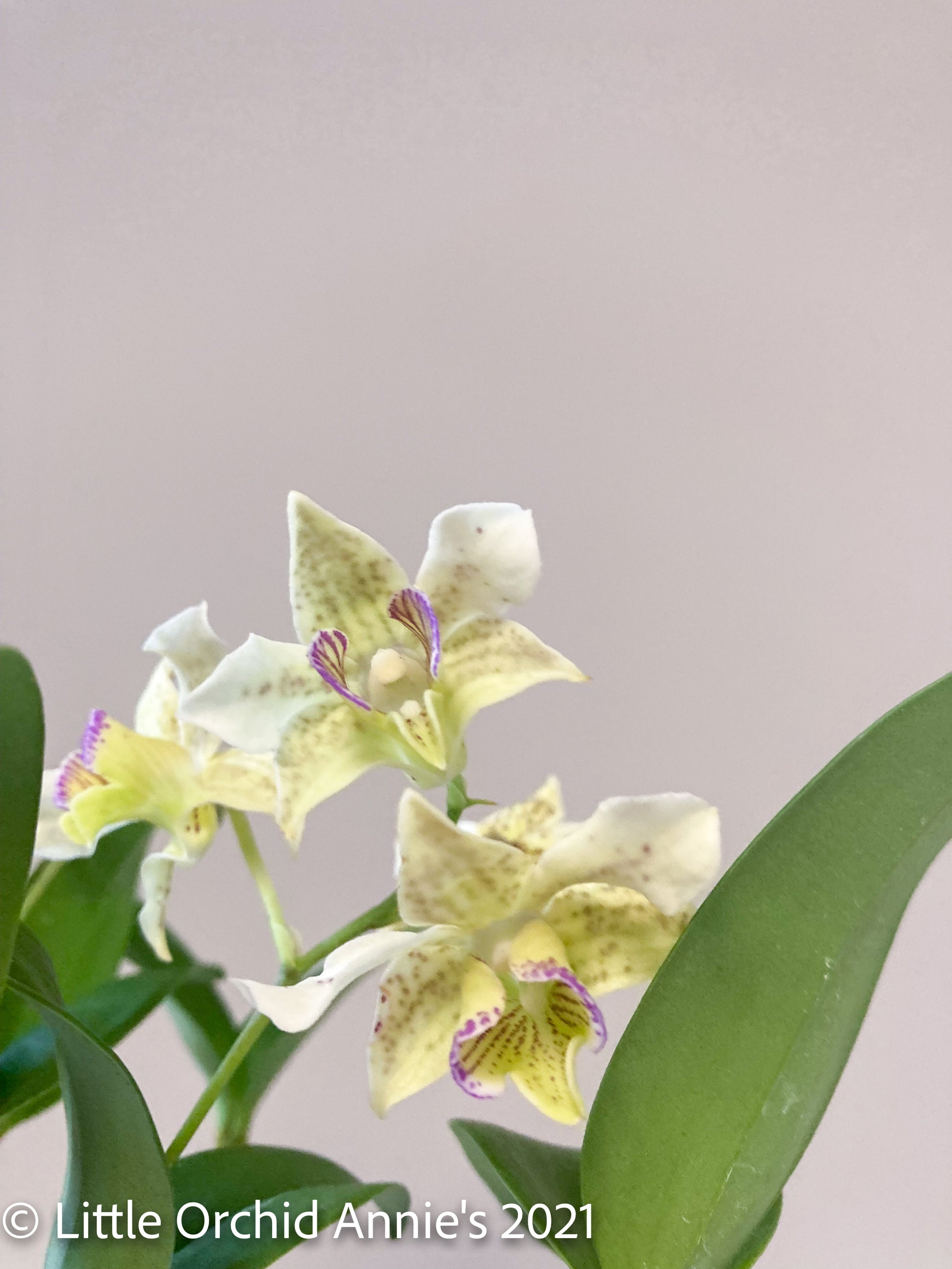 Latouria-type Dendrobiums are vigorous growers and easy bloomers provided they are given enough light. As a general rule, dendrobiums generally enjoy warmer, wetter Spring-Fall and cooler, drier Winters. This hybrid is an attractive, miniature Den that will not reach the typical large size of similar species. Smells like cinnamon or Snickerdoodles. No winter dry period required but cutting back on watering and fertilizing is recommended.