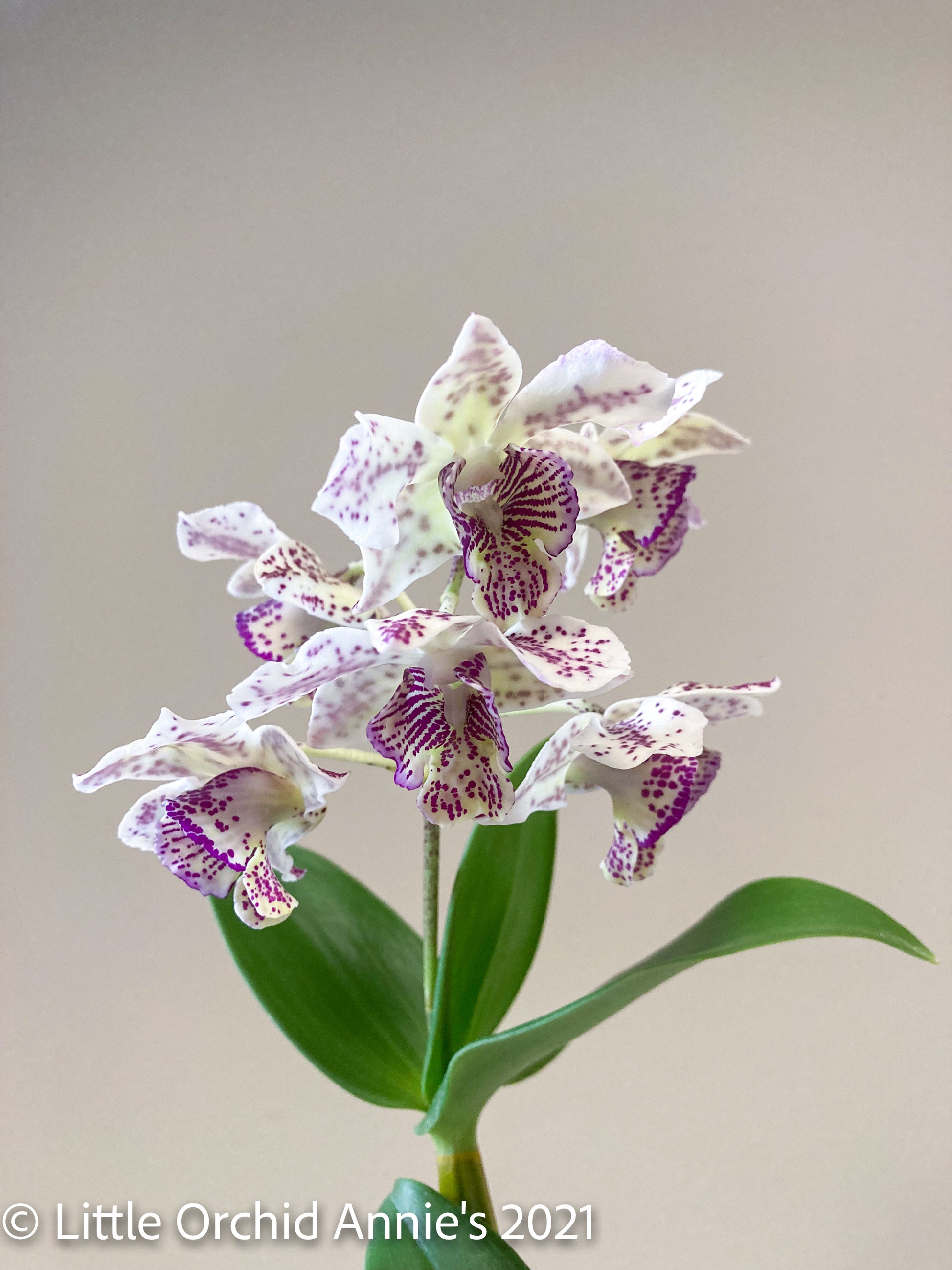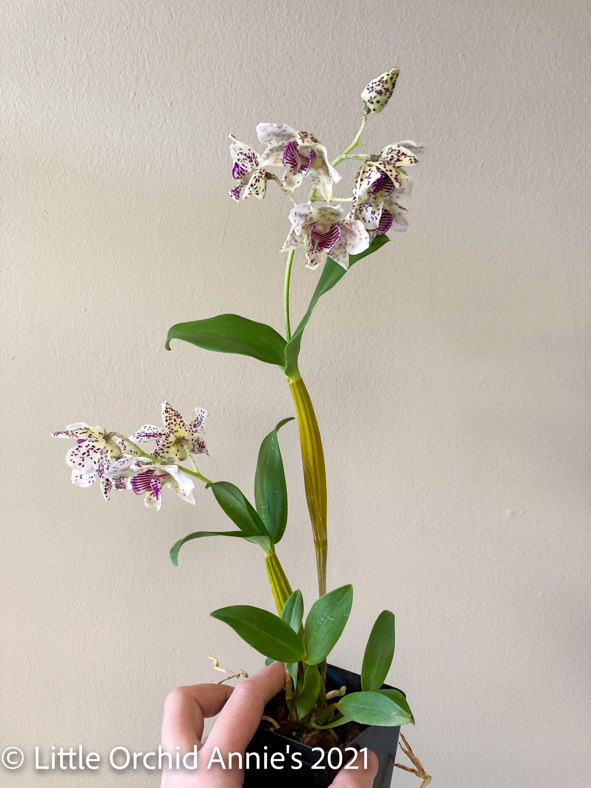 Latouria-type Dendrobiums are vigorous growers and easy bloomers provided they are given enough light. As a general rule, dendrobiums generally enjoy warmer, wetter Spring-Fall and cooler, drier Winters. This plant resembles the classic Den. Chocolate Chip but with slightly larger, more purple coloration. Flowers are white with purple speckling and maintain a sweet cinnamon scent as blooms mature. Does not require a winter rest period.