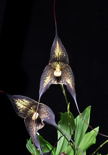 A dark creepy cultivar of Dracula (monkey-faced orchid) native to mountainous South America. Draculas can be challenging for indoor growing and are recommended for intermediate-advanced cultivators. Greater than 60% humidity and cooler conditions make it a tricky genus. Hybrids tend to be more stable and slightly easier, so this would be a good one to start with if just starting. Above 70F and you may see leaf drop or wilt. Keep air circulation good for high humidity. Very cool cultivar though!
