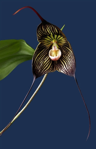 A very dark and attractive cultivar of Dracula vampira (monkey-faced orchid) native to the cloud forests of Ecuador. Blooms reach up to 12 inches in length! Draculas can be challenging for indoor growing and are recommended for intermediate-advanced cultivators. Floriferous! Cool-intermediate grower. This one should not go above 75F or leaf loss will occur and it will not bloom. Put in a cool shady spot in the greenhouse or in a large terrarium.