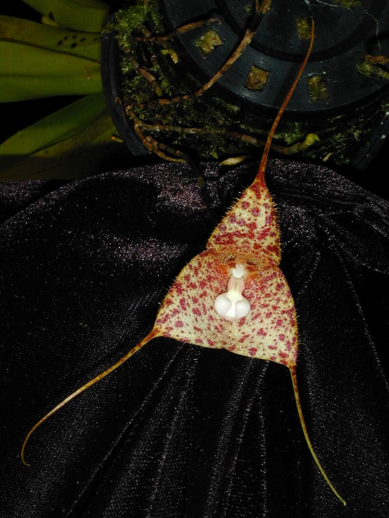 Mini Dracula (monkey-faced orchid) species indigenous to Panama. Spotty red and beige blooms emerge from the bottom or sides of the plant. Grow hanging to allow blooms to droop down. Draculas can be challenging for indoor growing and are recommended for intermediate-advanced cultivators. Floriferous! Cool-intermediate grower, relatively tolerant of temperatures higher than 85F. Put in a cool shady spot in the greenhouse or in a large terrarium. Blooms at random throughout the growing season.