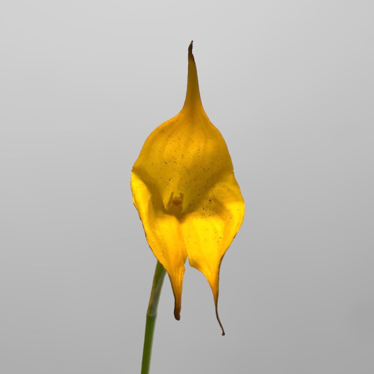 A very attractive (award winning) cultivar of Masd. Golden Monarch. This is a relatively compact plant but produces a tall spike with long 5 inch yellow flowers of a triangular shape typical of many Masd. Cool-intermediate grower. Will not tolerate drying out and will start to suffer above 70F. Not the hardest Masd, but recommended for intermediate level growers.