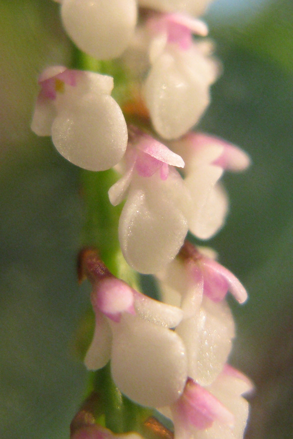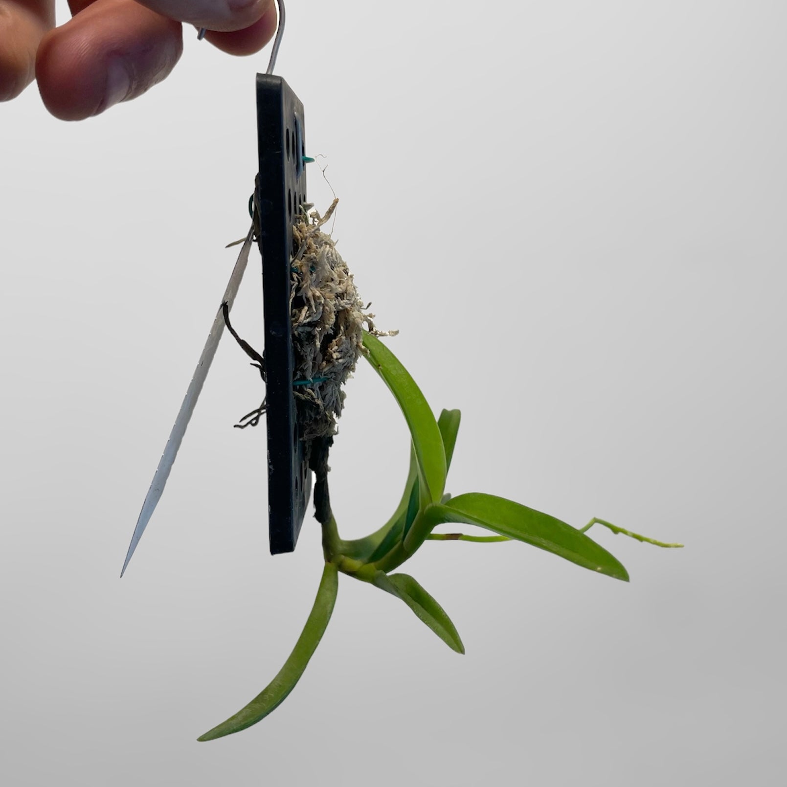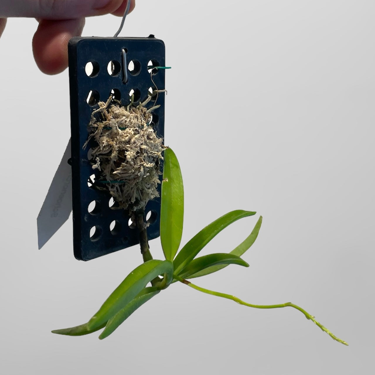 Mini orchid resembling Holcoglossum from China and the Himalayas. Has long spindly leaves that like to amble. Does very well mounted and prefers it. Tends to grow in a swooping motion and flowers will hang down in long spikes with a spiral of tiny white and pink flowers. Flower coloration is interesting with the top half being bright purple-pink and the bottom half a stark white. Quite a fun plant. Tolerant of extremes in temperature, prefers warm.