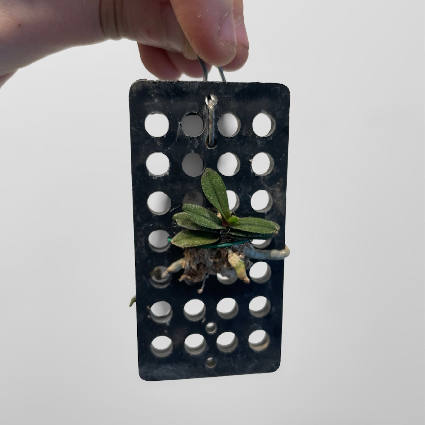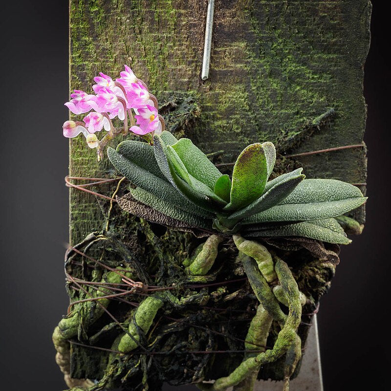 Mini orchid from Southeast Asia that has rough leaves and produces compact white blooms with pink ends that cluster around the base of the plant. Grows vandaceously/vertically and enjoys being mounted but will do ok potted in a fast draining mix. Slightly cooler grower that usually grows near the base of trees.