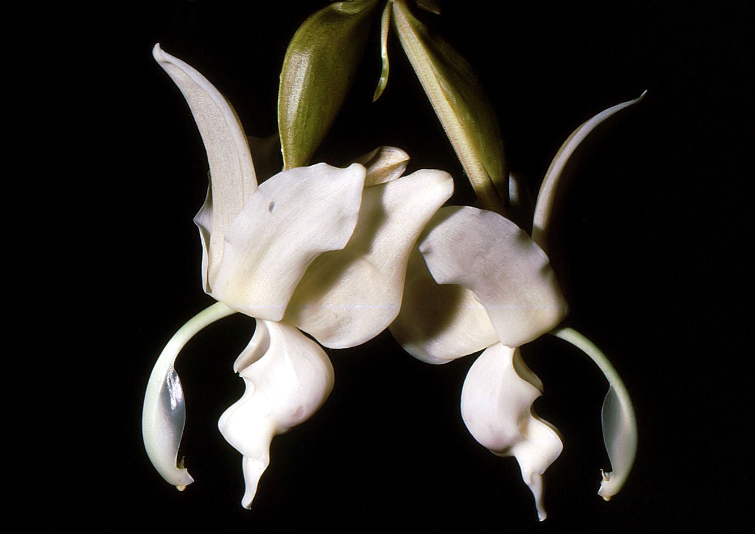 Uncommon orchid that will do really well in a greenhouse but isn't recommended for low humidity, household growing. Bucket-like blooms will emerge from the bottom and sides of the plant and last 2-3 days - it is recommended to grow in a basket or pot with large holes in the bottom. Medium-high humidity is necessary for flowers to form. Frequent watering, shaded bright indirect light.